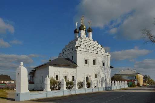 Read moreКирпичная церковь построена в конце XVIIв., внешние архитектурные формы были изменены в XVIIIв. в стиле раннего барокко. Бесстолпный двусветный четверик с трапезной и северным приделом поставлен на высокий подклет. Четверик перекрыт сомкнутым сводом, близким к куполу. В ходе реставрации 1970-х гг. был разобран прямоугольный алтарь XVIIIв. и восстановлены три древние апсиды, от которых сохранялись основания в подклете. Храм завершается ярусами кокошников и небольшим пятиглавием. Декор фасадов, срубленный в XVIIIв., восстановлен при реставрации по "хвостам" кладки. От шатровой колокольни, современной храму, сохранился первый ярус разрушена в советское время . В 1992 году, решением администрации города здание было передано православной...