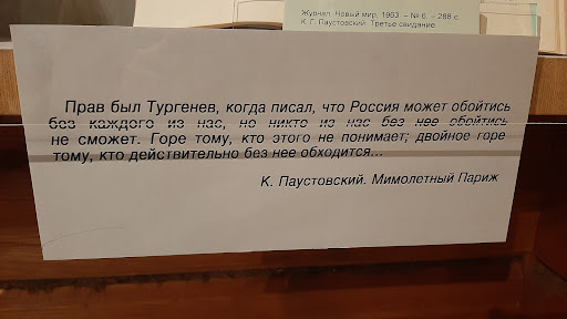 Read moreВдумчивому человеку этот небольшой музей будет конечно интересен, вне зависимости от глубины знакомства с писателем. К сожалению парковок в непосредственной близости нет, с ними вообще беда в выходной в Кузьминском лесопарке. Сам музей стоит в окружении деревьев, рядом есть мини зоопарк. В музее есть потрясающие дневники Паустовского 1917 года какое он...