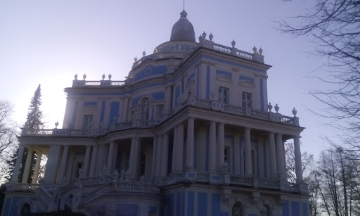 Павильон - одно из самых красивых сооружений Ораниенбаума. Это памятник переходного периода: от изящного кокетливого рококо к раннему классицизму. Павильон является лишь небольшой частью возведенного в XVIII в. огромного инженерного сооружения под названием "Катальные горы", строительство которого выполнено в 1762-1774 по проекту Антонио Ринальди и по расчётам русского механика, артиллерийского инженера и изобретателя Андрея Константиновича Нартова. Весь комплекс состоял из павильона, скатов и галерей и был прообразом зимних ледяных гор. На высоте около 10 сажен (около 20 м) находилась спусковая площадка, от которой шли 4 ската (один прямой и три волнообразных). Катались на специальных колясках, украшенных позолотой и выполненных в виде триумфальных колесниц, гондол и осёдланных зверей. Катание проходило до 1801, но поскольку денег на содержание постройки выделялось недостаточно, сооружение постепенно разрушалось, а в сер. XIX в. было разобрано. Из всего огромного комплекса до наших дней сохранился...