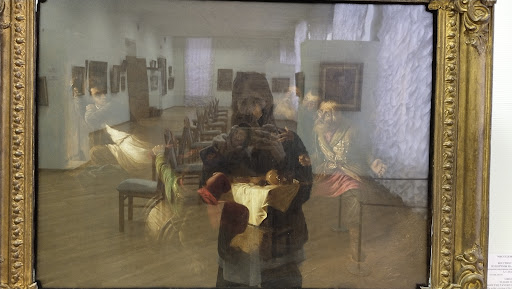 музейное стекло придумано не просто так! Во-первых, защита работ от ультрафиолета, во-вторых - оно не бликует! Некоторые шикарные работы просто НЕВОЗМОЖНО рассмотреть!