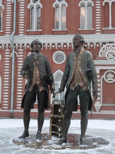 ΠΠ°ΠΌΡΡΠ½ΠΈΠΊ ΡΠ°ΡΠΏΠΎΠ»ΠΎΠΆΠ΅Π½ Π½Π° ΠΏΠΎΠ»ΡΠ½Π΅ ΠΌΠ΅ΠΆΠ΄Ρ ΠΠΎΠ»ΡΡΠΈΠΌ Π΄Π²ΠΎΡΡΠΎΠΌ ΠΈ Π₯Π»Π΅Π±Π½ΡΠΌ Π΄ΠΎΠΌΠΎΠΌ. ΠΡΡ ΠΈΡΠ΅ΠΊΡΠΎΡΡ ΠΏΡΠ΅Π΄ΡΡΠ°Π²Π»Π΅Π½Ρ Π² ΠΎΠ΄Π΅ΠΆΠ΄Π΅ ΠΈ ΠΏΡΠΈΡΠ΅ΡΠΊΠ°Ρ ΡΠ²ΠΎΠ΅ΠΉ ΡΠΏΠΎΡ ΠΈ ΠΏΡΠΈ ΠΎΠ±ΡΡΠΆΠ΄Π΅Π½ΠΈΡ ΠΏΡΠΎΠ΅ΠΊΡΠ° Π·Π°ΡΡΡΠΎΠΉΠΊΠΈ. ΠΠ°ΡΠΈΠ»ΠΈΠΉ ΠΠ°ΠΆΠ΅Π½ΠΎΠ² ΠΈΠ·ΠΎΠ±ΡΠ°ΠΆΠ΅Π½ ΡΠΎ ΡΠ²Π΅ΡΠ½ΡΡΡΠΌΠΈ ΡΠ΅ΡΡΠ΅ΠΆΠ°ΠΌΠΈ Π² ΠΏΡΠ°Π²ΠΎΠΉ ΡΡΠΊΠ΅, ΠΠ°ΡΠ²Π΅ΠΉ ΠΠ°Π·Π°ΠΊΠΎΠ² β ΡΠΎ ΡΠΏΠ°Π³ΠΎΠΉ ΠΈ ΡΠ»ΡΠΏΠΎΠΉ ΠΏΠΎΠ΄ ΠΌΡΡΠΊΠΎΠΉ. ΠΠ΅ΠΆΠ΄Ρ Π°ΡΡ ΠΈΡΠ΅ΠΊΡΠΎΡΠ°ΠΌΠΈ ΡΡΡΠ°Π½ΠΎΠ²Π»Π΅Π½ ΠΌΠΈΠ½ΠΈΠ°ΡΡΡΠ½ΡΠΉ ΠΌΠ΅ΡΠ°Π»Π»ΠΈΡΠ΅ΡΠΊΠΈΠΉ ΠΌΠ°ΠΊΠ΅Ρ ΠΏΠΎΡΡΡΠΎΠΉΠΊΠΈ....