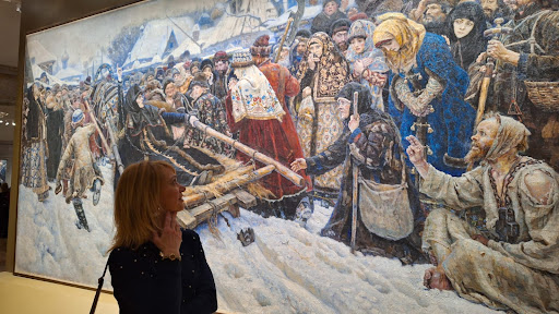 Здравствуйте мои непоседливые и любознательные любители прекрасного. На днях посетили Русский музей. Пришли не просто побродить по залам в поисках прекрасного, а с конкретной ценью - выставка Сурикова. Зашли в зал, и время замедлилось, пространство поменяло форму и вектор, сознание переместилось в другую эпоху, современный мир провалился в будущее. Сказать, что картины произвели сильное впечатление - ничего не сказать. Видела много раз и Морозову, и Суворова, и Меншикова, но в сети, с экрана компьютера. Больше всего поразила "Боярыня Морозова", не ожидала, что картина настолько эмоциональна. Момент изображенный на картине показывает отправку Феодосии Морозовой, активной противницы церковных реформ патриарха Никона, в место заточения. Её осудили за поддержку "устаревших" традиционных обрядов богослужения, и после длительных разборов, уговоров, судов отправили в острог. Церковные Реформы Никона проходили в народе туго, люди не понимали, и не хотели менять привычные обряды, которым следовали их отцы, деды, прадеды. Но против власти идти трудно. И на картине можно увитеть множество эмоций, котрые выражают отношение людей к новым церковным уложениям. Здесь и сочуствие Морозовой, и восхищение её стойкостью, и страх, на некотрых лицах недоумение и выражение пустоты, вопрос "как же так? Как жить дальше? Что будет с нами, если даже такая высокопоставленная боярыня осуждена?" . Есть, конечно и те, кто осуждает фанатичную староверку, и даже смеются над ней, народ "раскололся", и это видимо как раз то что хотел выразить художник. Сама же Морозова, с поднятой вверх рукой, как бы указывает на небеса, призывая народ не изменять свой вере и своим убеждениям. Лицо её мертвенно бледное выделяется среди других лиц, глаза смотрят с вызовом, и выражение её почти безумно, так, что становится страшно, глаз не отвести. Все герои картины настолько живые и эмоциональные, что кажется, стоишь в этой же толпе и кутаешься в телогрейку, уворачиваясь от вездесущих любопытных мальчишек, снующих между людьми, слышишь гул толпы, приглушенный, разноголосый. Мы ходили по выставке два с половиной часа, и несколько раз возващались к картине. Выставка будет в Русском музее до июня, время ещё есть, поэтому запланируйте себе поход в музей, не все картины хранятся в Петербурге(напрмер Морозова из Третьяковской галереи в Москве). Как всегда желаю вам здоровья, интересных прогулок и хороших...