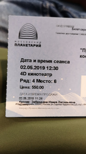 Read moreЗамечательный планетарий! Очереди практически не было. В начале экскурсии на первом этаже "Ураниума" было несколько экскурсий, стоял гул от детей, было плохо слышно экскурсовода. Но зато было много замечательных детализированных моделей космических кораблей и спутников, исторических фотографии, красивых изображений галактик и туманностей, метеориты, которые можно потрогать руками и многое другое! На втором этаже были более маленькие метеориты за стендом. Но самое главное - там были планеты Солнечной системы (в уменьшенном масштабе) и планеты, которые можно посмотреть с каждой стороны - Меркурий, Земля и Марс. Вскоре после завершения экскурсии вы подниметесь в большой звёздный зал. Это огромный купол, на котором проекцируются звёзды с помощью специального прибора - Universarium M9. Вам про него расскажут на замечательной экскурсии с потрясающим экскурсоводом! Вернёмся к большому звёздному залу. Кроме программы "Звёздное небо над нами" вы можете выбрать какой-либо сеанс для просмотра на куполе: "Солнечная система", "Супервулканы", "Розетта" и многое другое! В программе "Звёздное небо над нами" проекцируется 6500 звёзд. При просмотре фильмов можно подумать, что ты находишься в космосе - настолько всё реалистично. Мы попали на фильм "Солнечная система". Это замечательный фильм, рассказывающий о Солнце, о планетах и кометах. После посещения Московсого планетария остались протрясающие впечатления! Вы сможете узнать много нового о космическом пространстве, о звёздах, о нашей Солнечной системе, о планетах и о многом другом! Рекомендую посетить этот волшебный планетарий! Огромное спасибо всем сотрудникам...