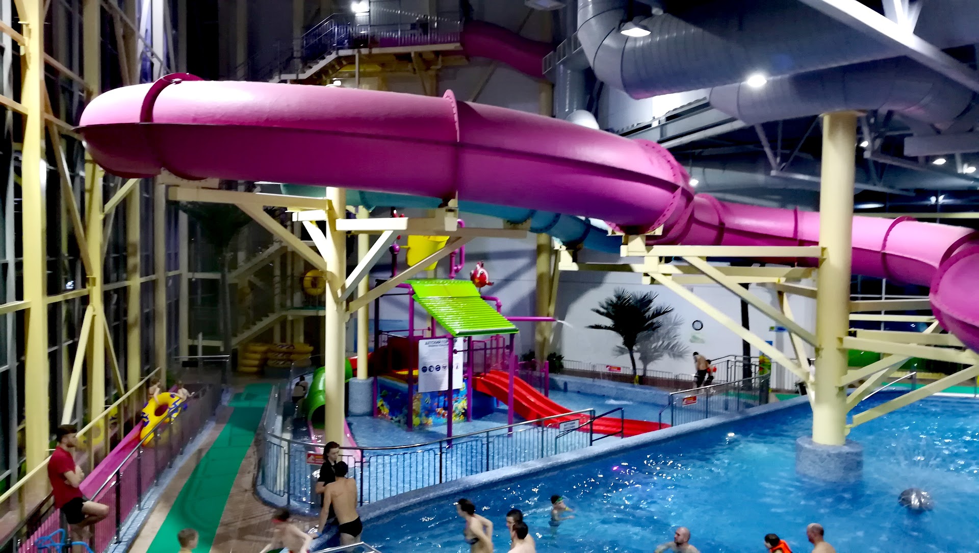 Хороший аквапарк. Есть детский городок с горками- для маленьких - отлично. Горки: семейный слайд- широкая, открытая горка; две трубы- розовая (высокая,для спуска на ватрушках), зелёная (чуть ниже розовой, для спуска без ватрушек)- обратите внимание на материал ваших плавок, не все плавки скользят на горках - у меня шорты для плавания не скользят; розовая - зачётная, особенно если ехать вдвоём и второго брать хотя бы килограмм 60 весом- так скорость больше, чем с ребёнком (хотелось бы горку поэкстремальнее). Есть различные виды бань и парных- для матёрых баньщиков, конечно, слабовато, тем более поддавать и париться нельзя, а просто сидеть - жару маловато. Хочу отметить турецкую и римскую парные- здесь можно хорошо погреться, но надо ловить момент когда есть пар. К бане и сауне прилагается холодная купель (но надо бы подбавить жару). В SPA бассеине и гидромассажной купели можно хорошо промять свои телеса под сильной струёй воды- отличный массаж. Жаль, что джакузи всего два- когда много народу сложно туда вбиться. Есть бар (к нему можно подплыть) и кафе- все растраты записываются на персональный браслет,- оплата на выходе из рая, в смысле из аквапарка. Везде чисто, персонал- внимательный. Вообщем для нашего городка отличный семейный отдых, но не для всех доступный. В будний день два взрослых и два ребёнка (8 и 9 лет), на 3 часа - 2450 р.+ ещё примерно 2000 р. поесть на выходе, в выходные примерно на...