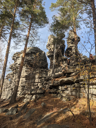 Read moreЗабавные небольшие скалы, типа каменных палаток. Легко добраться - на машине доехать можно до станции электрички (ну можно до туда и на электричке), дорога почти вся асфальтированная, кроме последних пары километров где-то, там отсыпанная хорошая грунтовка. А потом пешком минут двадцать-тридцать по тропинке и ты на месте. Часть дороги придется идти в довольно крутую горку, но даже такой пузан как я вскарабкался без особого напряжения. Нисколько не пожалели, что в солнечную октябрьскую субботу сюда...
