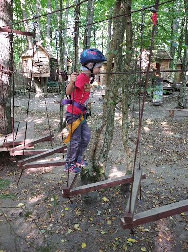 Большая территория, в лесу, поэтому тихо и прохладно. Интересный "джунгли парк", несколько уровней сложности для разных возрастов, даже взрослые учавствуют. (1 час три трассы 300р/чел) Для маленьких деток есть домики деревянные со своими лазилками(200р/чел). Несколько макетов динозавров, двигающихся и издающих звуки. Мини зоопарк-кролики, кошки, козы, лама, лиса (вонючий) Батутный уголок. Горка на ватрушках, но летом она не очень быстрая. Есть где перекусить. Пицца по 150р, несколько видов, напитки. Не понравился персонал продающий билеты, они ничего не знают. Прайса с ценами нет. Но после нескольких часов прогулки, уже во всем разбираешься.). Парк расширяется, строят новые объекты. Так что обязательно...