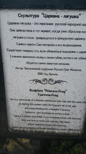 Складывается такое впечатление, что была целая семья этих царевен- лягушек, и вот знаете как говорят "в семье не без урода". Вот и тут так. Классическая царевна-лягушка из русских сказок была красавицей, а этой видимо не так повезло и природа ее красотой обделила. Прямо хоть новую сказку пиши про несчастную сестру, которую расколдовали только на половину, видимо из-за того, что принц, подаривший ей поцелуй ужаснулся ее глазищам и бросил несчастную. Поэтому она до сих пор сидит и ждёт своего суженного. ( В Светлогорске, где находится данная скульптура существует поверье, что поцеловав ее и загодав желание,...