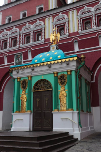 This is a decorative, teal green chapel adorned with gilded figures on the facade as well as a angelic figure holding the Russian Orthodox cross atop the chapel. The roof has a celestial pattern. It is a small but attractive building to view.