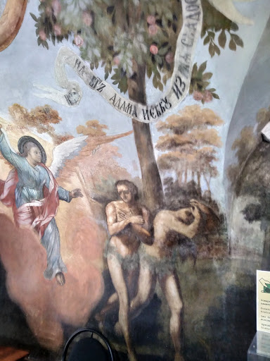 ΠΡΠΈΡΠ²ΠΎΡ ΡΠ΅ΡΠΊΠ²ΠΈ ΡΠ°ΡΠΏΠΈΡΠ°Π½ Π² XVIII Π²Π΅ΠΊΠ΅ Π½Π° ΡΡΠΆΠ΅ΡΡ Π·Π°ΠΏΠΎΠ²Π΅Π΄ΠΈ. Π‘ΡΠ΅Π½ΠΎΠΏΠΈΡΡ Π²ΡΠΏΠΎΠ»Π½Π΅Π½Π° Π² 1788 Π³ΠΎΠ΄Ρ ΠΌΠ°ΡΡΠ΅ΡΠΎΠΌ Π. Π₯Π»Π΅Π±Π½ΠΈΠΊΠΎΠ²ΡΠΌ ΠΈΠ· ΠΠΎΡΠΈΡΠΎΠ³Π»Π΅Π±ΡΠΊΠΎΠΉ Π‘Π»ΠΎΠ±ΠΎΠ΄Ρ ΠΏΠΎΠ΄ Π ΠΎΡΡΠΎΠ²ΠΎΠΌ Π½Π° ΡΡΠΆΠ΅ΡΡ Π±ΠΈΠ±Π»Π΅ΠΉΡΠΊΠΈΡ ΡΠΊΠ°Π·Π°Π½ΠΈΠΉ. ΠΠ°ΠΏΠ°Π΄Π½ΡΡ ΡΡΠ΅Π½Ρ Π²ΡΡΠΎΠΊΠΎΠΉ Ρ ΡΠ°ΠΌΠΎΠ²ΠΎΠΉ ΡΠ°ΡΡΠΈ Π·Π°Π½ΠΈΠΌΠ°Π΅Ρ ΠΊΠΎΠΌΠΏΠΎΠ·ΠΈΡΠΈΡ Β«Π£Π±ΠΈΠ΅Π½ΠΈΠ΅ ΡΠ°ΡΠ΅Π²ΠΈΡΠ° ΠΠΈΠΌΠΈΡΡΠΈΡΒ». ΠΡΠΎ ΠΈΠ΄Π΅ΠΉΠ½ΡΠΉ ΡΠ΅Π½ΡΡ ΠΈΠ½ΡΠ΅ΡΡΠ΅ΡΠ° ΠΈ ΡΠ΅Π΄ΠΊΠΈΠΉ ΠΏΡΠΈΠΌΠ΅Ρ ΠΈΡΡΠΎΡΠΈΡΠ΅ΡΠΊΠΎΠΉ ΠΆΠΈΠ²ΠΎΠΏΠΈΡΠΈ Π² ΡΠ΅ΡΠΊΠ²ΠΈ. Π ΠΎΡΠΏΠΈΡΡ Π²ΡΠΏΠΎΠ»Π½Π΅Π½Π° Π² 1772 Π³ΠΎΠ΄Ρ Π°ΡΡΠ΅Π»ΡΡ ΠΠΎΡΠΊΠΎΠ²ΡΠΊΠΎΠ³ΠΎ ΠΏΠΎΠ΄ΡΡΠ΄ΡΠΈΠΊΠ° Π‘Π°ΠΏΠΎΠΆΠ½ΠΈΠΊΠΎΠ²Π°. Π Π°Π·Π²ΠΈΡΠΈΠ΅ ΡΡΠΆΠ΅ΡΠ° ΡΠΈΡΠ°Π΅ΡΡΡ ΡΠ»Π΅Π²Π° Π½Π°ΠΏΡΠ°Π²ΠΎ ΠΈ Π²ΠΊΠ»ΡΡΠ°Π΅Ρ Π½Π΅ΡΠΊΠΎΠ»ΡΠΊΠΎ ΡΠΎΠ±ΡΡΠΈΠΉ ΡΠΎΠΊΠΎΠ²ΠΎΠ³ΠΎ Π΄Π½Ρ 15 ΠΌΠ°Ρ 1591 Π³ΠΎΠ΄Π°, ΡΠΌΠ΅Π½ΡΡΡΠΈΡ Π΄ΡΡΠ³ Π΄ΡΡΠ³Π° Π² ΡΠΎΠΎΡΠ²Π΅ΡΡΡΠ²ΠΈΠΈ Ρ ΠΆΠΈΡΠΈΠΉΠ½ΡΠΌ ΠΏΠΎΠ²Π΅ΡΡΠ²ΠΎΠ²Π°Π½ΠΈΠ΅ΠΌ.