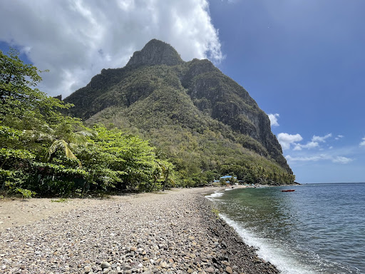 Sand isn't as white as the beaches north of the island because of the Pitons. So if your looking for turquoise waters - go north. However, the waters are nice and there are slight ocean waves. Definitely nice enough to swim.