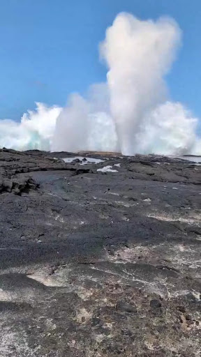 Definately a windy day at high tide makes the difference to get maximum effect. The blowholes and the entire shelf wall is made of volcanic rock that has molten into a crust, the walls formed against the ocean creates a hard surface for waves to hit and explode creating more entertainment and wow factor for photos.