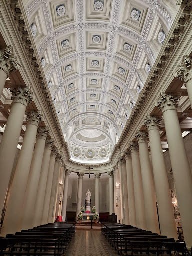From the outside, the basilica has a grand yet elegant appearance with its classical columns and symmetrical façade. Inside, the atmosphere is peaceful and reverent, with high vaulted ceilings, beautiful arches, and soft natural light that adds to the sacred feeling of the space.