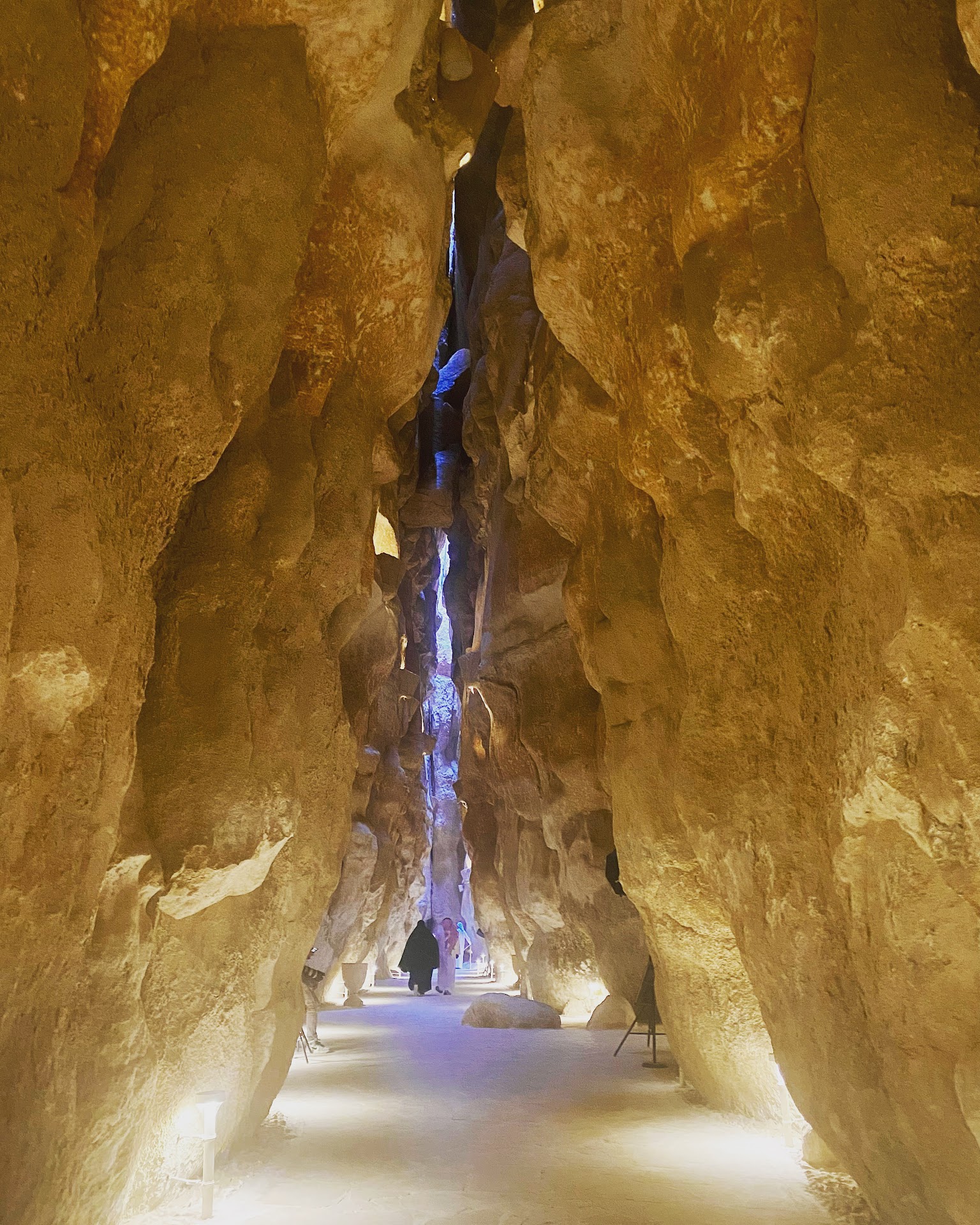 Once you are through 3-4 rooms of artifacts, you then walk into an open pathway which leads you to the hills and caves. This pathway is beautifully lit up. We then proceeded to the hills and then to the caves. All throughout, it was well lit up in multiple colors which added to the beauty of the hills. The caves were lit in one color to make the navigation easier. You do not feel any suffocation (for those who are claustrophobic). In fact, it felt cold and a bit windy as we walked through the caves/in between the hills (we went during mid-March).