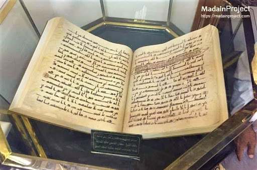 A copy of Mushaf e Uthmani (Quran bearing the blood of third caliph Uthman) produced during Era of Uthman ibn Affan. The original is preserved in the Topkapi palace, Istanbul, Turkey. According to tradition the original manuscript of this copy bears the marks of the blook of the third Caliph...