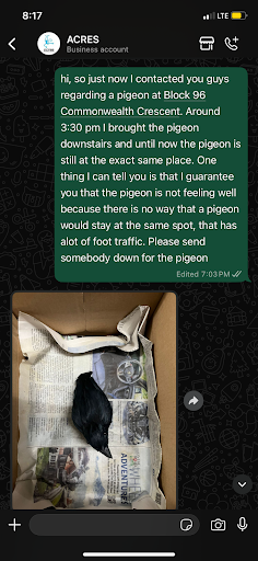 Read moreOn the 17th of July 2025, there was a pigeon outside my house. Initially I thought the pigeon was just chilling outside my house so I tried to scare it off but then I realised that the pigeon couldn’t fly so I contacted ACRES around 12 pm. ACRES told me to take photos and videos which I did and I sent it to them via WhatsApp, but they said that the pigeon looks fine. It’s just a young pigeon so bring it downstairs. so at first I gave the pigeon some water and then I brought it downstairs at 3 pm at 7:30 pm when I went downstairs to buy groceries the pigeon was still downstairs at the same spot I left it without moving at all so then I contacted ACRES once again and I told them that it is almost impossible that a pigeon would stay where it was left for hours where there’s so much foot traffic because usually birds get scared and they fly away. This pigeon did not budge at all. So then they told me to put the pigeon inside the box which I did so I put the pigeon in the box and I left it outside my house because I was scared someone would throw the box away if i left it downstairs, then I asked ACRES what time would they come and take the pigeon and this is their reply. I was highly disappointed and because I have a dog in the house, I don’t know how to nurture the bird back to good health so eventually I just let the bird go free . Anyways ACRES, please do not call yourself a wildlife rescue if you are not willing to rescue pigeons, bats, chickens, or rats, because on your Google reviews that are many one star reviews stating these types of animals that you guys are not willing to take in. if you’re only looking for specific animals, or if you’re only looking for birds that are more rare please state it...