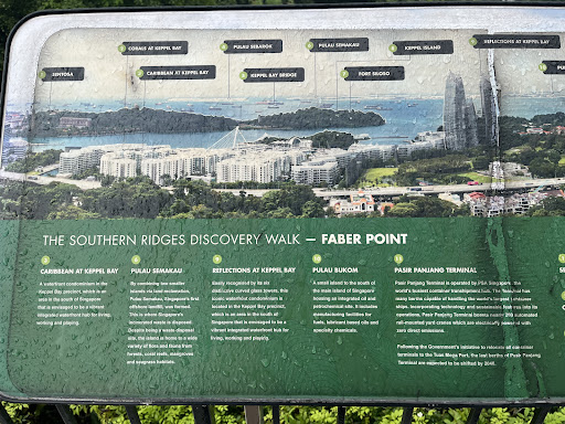 From Faber Peak walked up hill and staircase will reached Faber Point. Attached photos showed from how to get here from Faber Peak and where's the way to Henderson Wave. Faber Point is where the mini 3 meters tall Merlion status. At Faber Point can see Keppel Harbour. There are also glass panels embedded into the ground. These act as directional markers, pointing in the direction of some landmarks, example Mandai Zoo...