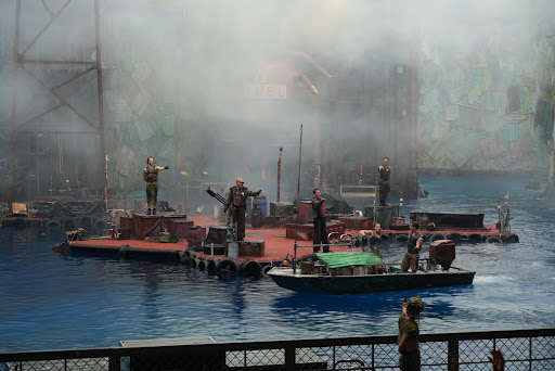 The story is a water downed (pun intended) version of the atoll invasion scene in the movie. Watching the movie helps a lot in understanding the context but otherwise just enjoy it as an action heavy stage show.
