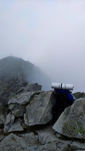 Na zdjęciu plecak zostawiony na wierzchołku turystycznym, droga granią i w oddali ja na wierzchołku taternickim. Wydaje się daleko, ale w tamtą stronę to jakieś 7 minut, a z powrotem 5. Ekipa ceprów ze szkoły albo wspólnoty dopiero odpakuje kanapki, a ty już będziesz...