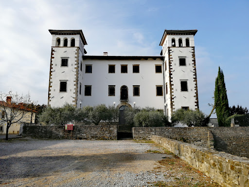 Il castello si innalza sopra l’abitato centrale del Collio, sul punto dove già nel XIII o all’inizio del XIV secolo si trovava una corte priva di fortificazioni. L’edificio attuale fu costruito nella prima metà del Seicento e fu di proprietà dei baroni, in seguito conti Colloredo. Essi ottennero questa tenuta in feudo agli inizi del XVI secolo. Nel 1789 il castello fu acquistato da Giovanni Battista II Catterini che dal 1782 portava il titolo nobiliare von Erzeberg. Alla fine del XIX secolo l’edificio passò in mano al conte spagnolo Silverio de Baguer de Corsi y Ribas che lo ristrutturò completamente, allestendovi nel 1885 una ricca collezione museale. La raccolta, che contava oltre 600 pezzi, aveva anche un catalogo stampato. Prima della Grande Guerra la famiglia donò parte della collezione ai Musei Provinciali di Gorizia. Durante il conflitto il castello fu parzialmente saccheggiato e devastato. L’esercito italiano allestì al suo interno un ospedale militare. Durante la seconda guerra mondiale il castello fu nuovamente depredato di oltre 2000 oggetti. Nel 1974 il castello fu affidato in gestione al Goriški muzej (Museo del Goriziano) che lo ristrutturò tra il 1979 e il 1991. Gli spazi ai piani superiori sono dedicati alle attività museali ed espositive. Il castello è concepito come un edificio cubico a due piani con torri angolari. Il complesso simmetrico, di stampo rinascimentale, è orientato sull’asse est-ovest. La disposizione delle aperture delle finestre nelle facciate est e ovest e l’accentuazione dell’asse centrale, conferiscono al castello il suo carattere barocco. All’interno si conservano ancora gli affreschi sulla scalinata, quelli nella sala della caccia (Clemente Del Neri, 1894) e nella sala...