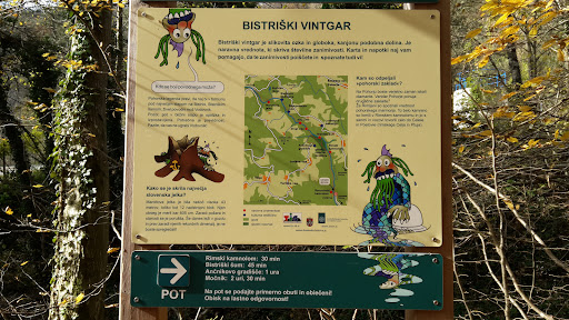 Bistriški vintgar je slikovita in zanimiva dolina potoka Bistrica, ki je polna naravnih posebnosti ter ostankov človekovega dela in bivanja. Skozi Bistriški vintgar je speljana pohodno-učna pot, ki je dolga 6 km in traja približno 3,5 ure hoje. Po približno pol ure hoje pridemo do Rimskega kamnoloma, kjer so Rimljani lomili marmor za rimske nekropole na Štajerskem območju. Od kamnoloma nas pot vodi proti slapu Šum. Malce naprej od slapa Šum lahko zavijemo na levo, kjer se nahaja Ančnikovo gradišče. V gradišču so izkopali kovaške izdelke iz 4. stoletja. Od odcepa za Ančnikovo gradišče se lahko na desno povzpnemo proti Ošlju, kjer si lahko ogledamo Lorbekovo domačijo, ki je ena redkih, ki je ohranila svojo prvotno podobo. Če nadaljujemo pot pridemo še do Štampharjevega mlina in...
