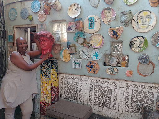 This is an eccentric, off-the-beaten track art spaza shop/shack and art house with a small tea garden attached to the owner's main house. A range of recycled objects liberally incorporated into art works, form a sculpture garden into which you wander. On the roof of one small outbuilding covered evenly with round plastic objects, it looks as if a layer of giant glistening dew drops has settled there. The plastic-clad radio tower which happens to stand in the back yard, alone is worth a visit. If you liked the Owl House in New Bethesda, this is the Jozi must-see version, complete with permanent garden sculpures by a local artist. In order to clad the radio tower with recycled plastic up to a dizzying height, a crane was hired for a couple of days! The Spaza Art Gallery is located in an area of Johannesburg which is currently being revamped. Owner Andrew Lindsey has converted rooms of his house into exhibition spaces, while he lives in one of the rooms. When we visited, a delicious vegetarian meal was served with tea in the small garden. Art works and craft objects on sale are reasonably priced. Worth a visit, but check that the owner is home, his cell number is...