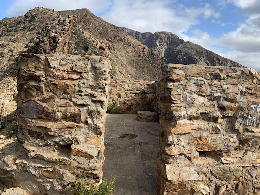 This stone and mortar fortification was built in 1899 at the start of the Second Boer War (which lasted from 11 Oct 1899 to 31 May 1902). It was constructed by the stonemason William Robertson at the behest of an English company which was stationed in Montagu. An interesting detail is that the company was camped at the site which is now the parking area below the fort on the Montagu site. Perched high on a rock above the road, it has 21 loopholes for surveillance and firing upon any adversaries. The site was declared a monument in 1999, a hundred years after the start of the 2nd Boer War. The trail to the fort lies on the right side of the road (approaching from Montagu) and is easy (5 to 10 minutes and less than 100 metres). There are some loose stones on some areas so wariness advised. At the top, the Ashton side features a sheer drop down - caution advised. Beautiful views - totally worth the climb. A stunning reminder of history...