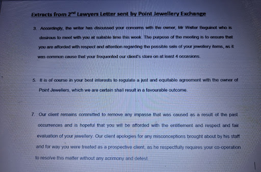 I had an extremely bad experience when trying to sell my old gold jewellery to Point Jewellery Exchange. Mark told me he pays based on the current spot price less 10%. He showed me the spot price on his laptop. He weighed everything on his two scales. He wrote his calculations on a small piece of paper while I put everything into a spreadsheet so there would be no errors. At the end his calculation was over R3000 less than the spreadsheet. He went through his calculations with me and I shockingly discovered that the difference was because: He was not using the current spot price he had shown me on his laptop. He was using the previous day's lower price. He was not using the weights he showed me on his two scales. He was using lower weights. For jewellery with diamonds and sapphires he was decreasing the weight by arbitrary amounts AND he was not paying me for the diamonds and sapphires AND he was keeping the diamonds and sapphires for himself for free. He was penalising me in THREE ways all for his benefit. For certain items he was deducting 25% commission instead of the 10% he told me. He told me to send him my spreadsheet which I did and he went through it 26x but he still refused to rectify his errors. He insisted I must accept his factually incorrect calculation. I said No. Furthermore, he gave me a written quote the day before to fix 3 broken items of jewellery. Now he told me the quote was X. This was much higher than the written quote. When I showed him his written quote he backed down. Because of all this I did not sell my jewellery to them and I did not fix my jewellery with them. I told Mark I would be writing a review and promptly I received a lawyer's letter from them threatening me to keep quiet and not write a review or they will sue me. Reviews are legal everywhere in the world because of Freedom of Expression and Freedom of Speech and when it is based on facts and it is in the public's interest. We are not living in Apartheid South Africa any longer, we are living in a Democracy and Freedom of Expression and Freedom of Speech are enshrined in our Constitution. Be careful if you do not understand how the gold price works and if you don't check his calculations like I did. I have kept his calculations as evidence should they decide to sue me for writing...