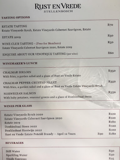 Read moreA number of years ago, we stumbled upon Rust en Vrede after leaving Ernie Els very hungry and in high dudgeon at the cost/value ratio. At Rust and Vrede, we began with a wine tasting and, upon being told that the wine tasting would be gratis if we opted to have the Chalmar sirloin lunch, we were simply too greedy to resist. We accepted the offer. This turned out to be an excellent decision: the meat was beautifully tender and tasty, the salad came up to expectation, and the chips were perfection. Furthermore, our waiter must have been new to the game (we now realise) because she practically filled our wine glasses to the brim. Consequently I left there in a state of high glee and giggled my way back home (no, I was not driving). Yesterday, we returned to Rust en Vrede, having finally remembered its name and figured out its locality (very simple: turn off the R44 at the Annandale intersectionright at the end of the road that passes Root 44's entrance). We discovered that the menu has doubled (there are now all of TWO dishes on the menu, both exceptionally delicious and well executed - the Chalmar sirloin remains, and is joined by Salmon and asparagus). The wine is still very good, though no longer quite so copious; and the beauty of the venue remains unspoilt. No dessert on the menu; only coffee, but what delicious coffee, and served in Le Creuset cups (of an unusual soft teal green colour), which keep the coffee at a good temperature for longer than usual. The service is excellent; the seating is simple yet elegantly comfortable. The frites might well be the...