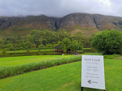 Read moreWe recently visited Stark-Condé for a wine tasting as we were looking for a Syrah and we heard that they had a good one. The farm is nestled in the Jonkershoek Valley in Stellenbosch and the road leading up to it is beautiful, as you are surrounded by trees, farmlands and mountains. On the farm they have a restaurant which I have previously visited, but I haven't been there in a while so not sure how it is now (it was very busy so it seems to be popular, though). The Wine Tasting center is located in a small building on a deck in the middle of a large pond with a walkway leading to it from the restaurant area. There are also some beautiful trees surrounding the Wine Tasting center which makes for perfect photo opportunities. Their tasting room is small with a deck surrounding it, providing some inside and outside seating options. The day we visited it was raining so most of the outside seating wasn't usable and the inside seating area was packed. Luckily they found a table (we were only 2 adults and a toddler) outside under the roof for us. They have a couple of wine tasting options with their standard tasting allowing you to choose 5 wines to taste including Rosés, Whites and Reds. Their wines are a little bit pricy, but definitely worth it and I am glad to say their Syrah lived up to the hype. Sipping on their delicious wines while taking in the surrounding beauty, and then all of a sudden it starts raining - all I can say is, the experience was...