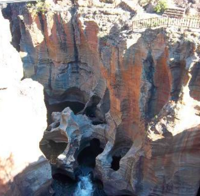 Here you follow a well marked trail around 6-8 minutes to where the Treur and Blyde River converge and fall over a crag and into a narrow gorge. There are three pedestrian bridges over the gorges allowing excellent views of the cylindrical potholes and river flowing below.