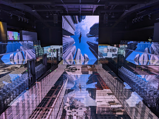 Another example is similar, where you get a dark room with a projector beaming something on the wall. Could be cool, but they put bright TV screens on the opposite wall, so you can't clearly see what's happening on the projected screen. And no, it's not on purpose.