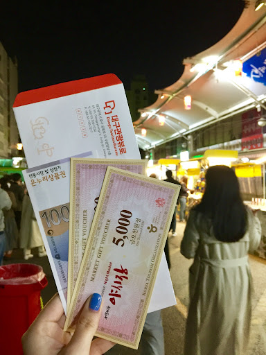 Before coming here, we were handed coupons or market vouchers by Korea Tourism Organization and Daegu Tourism Organization which was awesome 😊😄👍. I personally received a total of 20K won which I used to buy food, desserts and some unique souvenir from this market. These vouchers are good as cash and you can get real money if there's an exchange. It was so much fun roaming around this market, especially with different stalls selling various kind of mouth watering food. I know the vouchers were not enough but it's understandable considering the variety of food being sold in this place.