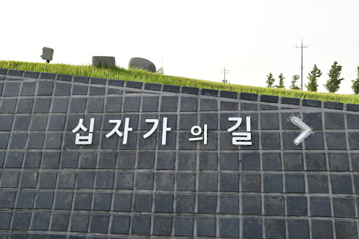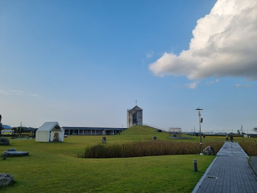 In a country where over 70% of the land is covered by mountains, the experience of wandering through flatlands was already quite special. During a visit in the autumn season, I passed through the golden rice fields of Dangjin and arrived at the Sinri Sanctuary. Along the way to the main chapel, I encountered several prayer rooms and a wall that surrounded them, which started low, rose to some height, and then lowered again. Following this wall, the scenery of the sky and the horizon seemed to disappear and reappear. At the end, my gaze was drawn to a prominent exposed concrete building.
