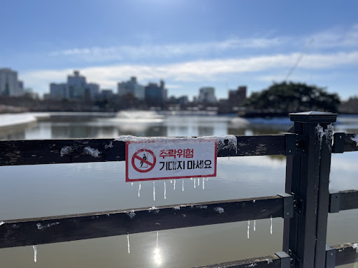 Good place for jogging. Surrounding the park, there are many work out facilities. In the lake located at the center of the park, there are ducks and fishes. Spring season is good, especially for cherry blossom, to walk and enjoy sun lights. When it is snowing, night view is awsome with lights and you can feel calm with snow...