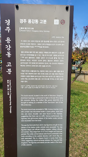 경주용강동고분(慶州龍江洞古墳) 통일신라의 돌방무덤. 석실분. 문화재 지정 사적 제328호 건립시기 통일신라시대성, 돌방무덤, 석실분 유형 유적 면적 1,808㎡ 소재지 경상북도 경주시 용강동 1130-2외 1989년 사적으로 지정되었다. 1986년 6∼8월에 경주고적발굴조사단에 의해 발굴조사가 실시되어 무덤의 성격이 밝혀졌다. 발굴조사는 향토사학자들의 모임인 신라문화동인회의 사전조사로 신라 왕릉급의 무덤이 틀림없다는 판단 아래 학술발굴조사와 정비보존을 건의한 결과 이루어졌다.