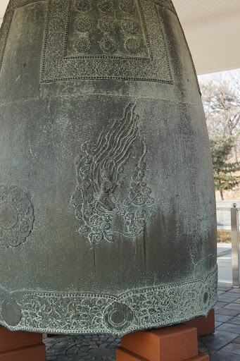 The Sacred Bell of Great King Seongdeok is the largest bell in Korea, measuring 3.75 m in height, 2.27 m in diameter (at the rim), and 11-25 cm in thickness (of the wall), and weighing about 25 tons. King Gyeongdeok of Silla commissioned the casting of the bell to honor the virtue of his father King Seongdeok, but he didnโt live to see its completion. It was eventually completed in 771, during the reign of King Hyegong, the son of King Gyeongdeok, and was named the Sacred Bell of King Seongdeok. The bell is also known as the Bell of Bongdeoksa Temple, because it was hung at the temple at first; and as the Emille Bell, a name which derives from a legend that a baby was sacrificed to produce this bell. It has a hollow tube on top that is designed to control the tone - a unique feature of Korean bronze bells - and a hook carved in the shape of a dragonโs head next to the tube that was used for hanging the bell. The bell is carved with a number of splendid patterns that represent the zenith of Silla art: There are two wide bands featuring flower patterns in relief around the bellโs mouth and shoulder, and below the shoulder bands there are four square blocks, each containing nine embossed designs in the shape of lotus flowers. Two pairs of Apsaras (Celestial Maiden) are cast in relief below the square blocks, and two striking points are raised in the shape of a lotus flower between the Apsaras. The bellโs mouth has several rhombic edges, showing a unique style. The bell also contains two inscriptions concerning its production. Consisting of about one thousand Chinese characters, they attest to the brilliant writing and carving style of the period, and have been well preserved for nearly 1300 years.