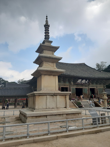 The three-story body of this stone pagoda stands on a two-story platform, displaying the traditional style seen in the East and West Three-story Stone Pagodas at the Gameunsa Temple Site, Gyeongju (National Treasure No. 112) and the Three-story Stone Pagoda at the Goseonsa Temple Site, Gyeongju (National Treasure No. 38). This style of stone pagoda reached its peak in the mid-8th century during the Unified Silla Period. The two-story platform was strong enough to sustain the full weight of the pagoda. Imitating the wooden construction style, the pagoda features stone pillar-shaped carvings at each corner of the upper and lower platform. Such carvings were also made on the pagoda’s body, and the corners of the roofstone are all raised, lending the pagoda an impression of lightness, as if ready to fly away. Although the platform and body of the pagoda are simply expressed without decoration, its upper extremity looks splendid. In fact, the original finial of this pagoda is assumed to have been lost sometime before the 16th century, and was only restored in 1973, imitating the ornamental finials of the East and West Three-story Stone Pagodas of Silsangsa Temple, Namwon (Treasure No. 37), which were made 100 years later than this pagoda. The pagoda is marked out, being surrounded by stones with lotus designs in every direction. It is separated to stand for the divine place for enshrining the Artifact of Buddha. The mark makes the pagoda look grander, being more or less unique to this pagoda and rarely seen elsewhere. The work looks very settled from any direction due to its excellent balance, and exudes simplicity and grandeur. Its construction can be loosely dated to shortly after the time when Bulguksa Temple became properly established as a temple, which, according to a record about the temple, was around 751. For many centuries the original structure was preserved in perfect condition, but, regrettably, it was damaged by robbers in September 1966. Afterwards, in December of the same year, the pagoda was perfectly reconstructed, leading to the discovery of a square space (in the front side of the second story of the pagoda’s body) containing Artifact associated with the Buddha. Various artifacts and reliquaries were found there, the most prominent of which was the Spotless Pure Light Dharani Sutra (National Treasure No. 126). Printed on mulberry paper, this sutra is the world’s oldest material printed by woodblocks. The pagoda is also known as Muyeongtap, literally meaning “a pagoda that casts no shadow.” This alternative name is related to the sorrowful legend of Asadal, a mason of Baekje who built Seokgatap Pagoda, and his wife Asanyeo. It is said that Asanyeo came to Seorabeol, the capital city of Silla, to meet her husband, but when she was unable to find him, she became desperate and drowned herself in a pond. (출처:문화재청...