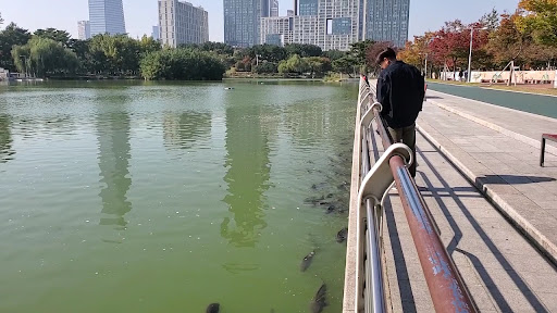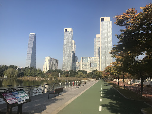 Beautiful and very diversed park that has everything: several children playgrounds including massive slides and a kids' sandbox-sandpit (yes, a pile of sand for kinds to play in/with in Korea!), hammocks to nap in (seasonal), many elevated wooden platforms for picnics, two water fountains areas for kids to run through in the summer, whales water fountains with water spraying from 🐋 backs, a cozy library, a convenience store, public restrooms, many many benches and gazebos. There is a loop path around the park with padded pedestrian track and a bicycle track. Not enough? How about a huge green for ⚽️ or ⚾️, a large pond with fish and turtles, several rose gardens, and colorful mosaic walls!...