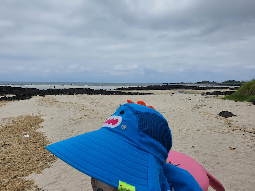 아이와 제주여행에서 두번째로 가게 된 해수욕장인데 물이 앝아 유아들도 놀수 있을것 같네요. 이곳에서 물놀이 보다는 보기드문 줄무늬 작은 물고기 와 여기저기 모래바닥에서 솟아나오 는 용천수(찬물) 덕에 이색적인 체험 을 했던것 같아요.