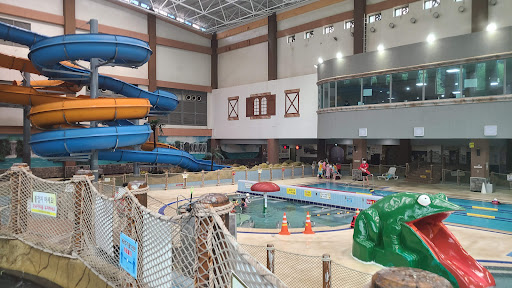 Read more수영장 내에 식당도 있고,5종류의 풀이 있는데,유수풀,유아풀,온열탕,안마탕,수영 풀이 존재하며,슬라이드는 모두 5종류인데 120cm150cm 까지 탈 수 있는 짧은 슬라이드가 3종류,150cm100kg까지 탈수 있는 긴 슬라이드가 존재한다.긴 슬라이드는 수영복만 이용할 수 있다.수심은 유수풀은 1m,수영 풀은 1.25m이고 유아 풀은 25cm이다.유아풀엔 조그만 개구리 모양 슬라이드가 하나 있는데,긴 바지를 입지 않으면 다리가 따갑다.그리고 수영 모자가 없으면 들어갈 수 없기에 대여소도 있는데 수영모자의 대여금은 천원이고 보증금이 이천원이다. 식당에는 불고기 비빔밥? 비슷한 것이 있고,우동,돈까스 등과...