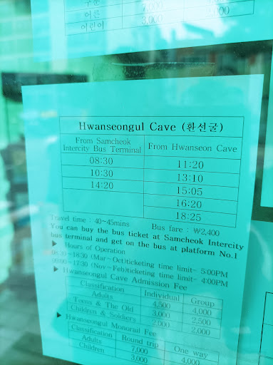 Read more[Samcheok High School Change Maker Project 2018] Hi! I'm local here. I wanna recommend solo travelers Hwanseon Cave one of the most beautiful natural attractions in Samcheok for its wonderful sight. It costs 4,500 won for adults and 2,800 for teenagers. You don't have to reserve before you enter the cave. It takes about 15~20 minutes from Samcheok terminal by taxi and it costs about 30,000won. Also, I wanna recommend you the popular restaurant in Samcheok- Sindari noodle restaurant. It sells Dongchimi noodle, Yeolmu noodle etc. Among others, I recommend the Dongchimi noodle for its unique taste-cold, contrary to common belief that foods should be hot or warm. In addition, it's not spicy. There are two tips for you. First, you should bring long-sleeves because of the low temperature in the cave. In addition, you have to walk around 20 minutes before...