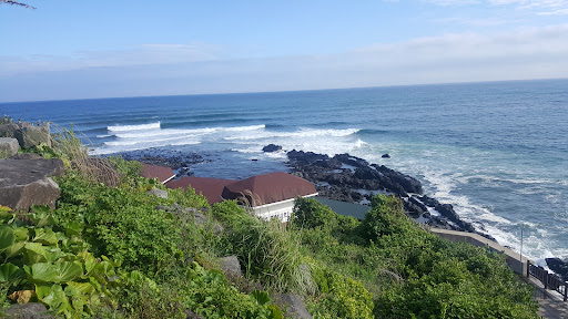 ย ย ย Read moreThe weather was not great when we went, and out of season for swimming, but there were loads of surfers. First let me preface, I am from Australia and KNOW beaches. This one is very different. The sand is course with a mixture of black, red and white sand. The beach us quite wide and surrounded by cliffs. There are volcanic rocks on both sides of the bay and lush vegetation at its back. I liked this beach alot. It had a sheepish access to it, but manageable and more like a ramp. You can walk down from steps at several points from the cliffs. There is also a board walk part way along the beach that goes past a waterfall and surfboard graveyard??? There weren't many people when we went, but I think kin Summer it would be crowded. It is the most famous beach on Jeju. Not my favourite, but worth a visit...