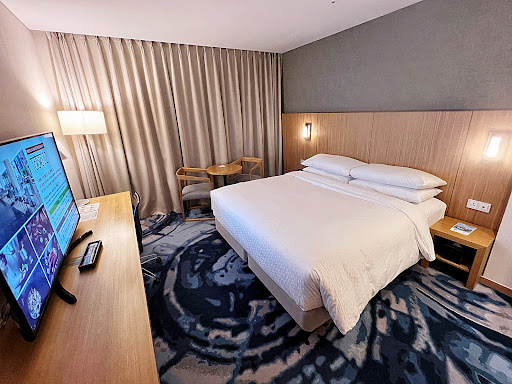 Read moreWe hadn't planned to stay here, in fact we thought that we had booked the Four Points by Seoul Station but, through a combination of clicking quickly online and not paying attention, we ended up standing in the Reception of the Four Points by Seoul Station, trying to book in, when our booking had actually been made for Guro-gu -some 10 stops and a line change away on the metro!||||Our initial reaction was to ask if we could transfer our booking - the two hotels are, after all, members of the same organisation; but a particularly unhelpful / reticent member of staff forced us to come to the conclusion that we would have to bite the bullet, do the journey (four suitcases between us!) and head to Guro.||||This is perhaps the only 'con' of the hotel, getting to it in the first place. The Seoul metro is pretty good for providing elevators or escalators, we only came across two sections where we had to just take a deep breath and lug our suitcases up a flight of stairs, but we were lucky to be doing this on a relatively quiet Sunday afternoon; it is not something I would like to attempt on a busy weekday.||||That said, outside the hotel is a stop for the excellent Airport Limousine Bus service so, if you are coming to the hotel from the airport, this would be an option. At the moment, there is only a limited service but, as Covid restrictions ease, the timetable should expand to it's former regular service. It is also only about an hour's journey from the airport and, at the end of our visit, Reception staff called attaxi for us, which was a highly convenient way to travel and very reasonably priced.||||Oh what a difference, walking into the Four Points in Guro - the staff were friendly and so welcoming and, clearly seeing that we were completely drained from our journey, couldn't do enough to make check in quick and simple.||||Guro is a much less urban district, wide open streets, and the hotel opens onto the pavement, set back from the road, with a huge Reception area, a Dunkin' Donuts and a Starbucks to one side and part of the hotel building. An overall feeling of space and light, which we hadn't experienced in their sister hotel.||||We had a spacious room on the 12th floor, where we could watch the traffic and people below, but were not disturbed by any noise. A large, very comfortable bed, with a veritable mountain of pillows, a couple of armchairs and table by the window, desk and chair and wall-mounted TV above. Plenty of charging points for tech and the power points by the bedside were universal and also had USB points within them.||||The shelf for suitcases was welcome. There was also a good sized wardrobe and drawer space, ironing board and iron, room safe and fridge with complimentary water each day. The amenity tray had kettle, cups and glasses and a modest array of tea and coffee - there were also toothbrushes, shower cap, soap etc.||||Having a bath was a real boon, as we had been staying in an apartment for seven weeks with only a shower; and we both took the opportunity to have a good soak and then relax in the complimentary bathrobes and slippers. The bathrobes were a little snug - my other half struggled around the middle and with the length - a couple of towels each, with the bath towel passing the modesty test (I could open the door, wrapped in a towel and maintain my modesty).||||Masses of hot water and a fancy toilet seat which performed all sorts of functions!||||On a day to day basis, the location of the hotel was just ideal, a five minute walk to the metro and we could access anywhere in Seoul, yet coming back at the end of the day, the area was quieter, less rushed and felt more open than the city.||||We didn't eat within the hotel, breakfast seemed a little pricey, and there were plenty of places to eat within a 5 minute walk; there is a particularly good bakery with a stall within the metro station and a number of 'chain' bakeries en route to the metro, burger joints, ice cream parlours and traditional Korean restaurants. There is also a large EMart just up the road from the hotel, a couple of minutes, if that, where you can pick up snacks or sit down at the fried chicken outlet within the store.||||In the end, we were SO pleased that an inadvertent mouse click had brought us to the Four Points in Guro, because we were very happy with the hotel, the location, the facilities and the staff who, throughout our stay, were friendly, welcoming and professional. Their standard of English was really high (much higher than my Korean!) and they were very helpful in giving advice as to the best way to get to the airport and then making arrangements for us, even coming out to the taxi and helping load up our luggage.||||After a day in the city and travelling on the busy metro, it was something of a relief to return to the quieter suburbs of Guru and the space and light of the hotel. We would...