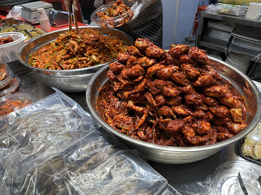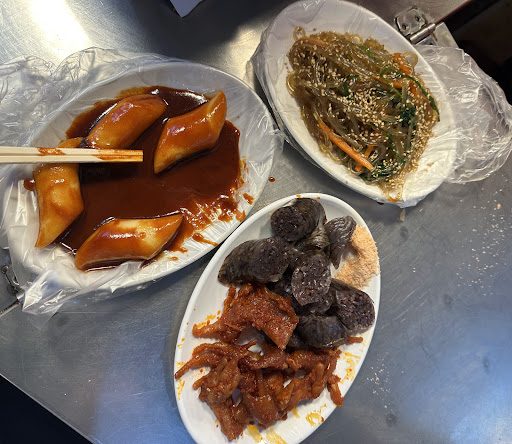 The food was hella bland. A friend and I went there for our first dinner/night out and were not impressed. The tteokbokki and sundae was a hard pass for me after my first bite. The japchae and bone free dakbal was okay; however, seeing how the vendor was handling the food with gloves that she had she just took money from other customers made my stomach turn. Total price for 4 items was 25,000KRW