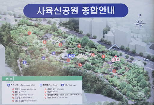 ๊ณต์์์ ๋๋ณด๋ก ์กฐ๊ธ ์ฌ๋ผ๊ฐ๋ฉด ํ์ด๋ฌธ์ด ๋ณด์ด๋ฉฐ, ์ฌ์ก์ ๋ฌ์ ๊ดํ ์ค๋ช ๊ณผ ๋ถ์ด๋ฌธ(2๋ช ์ ์ฃผ๊ตฐ์ ์ฌ๊ธฐ์ง์๋๋ค๋ ๋ป)์ด ์๋ค. ์ฌ์ก์ ์ ์๋๋ค์ ์ํจ๊ฐ ๋ชจ์ ์ ธ ์์ผ๋ฏ๋ก ๊ฒฝ๊ฑดํ ๋ง์์ผ๋ก ์ ์ฅํ์.