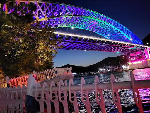 ๊ธธ์ด๋ 591mยทํญ์ 20m์ด๋ฉฐ 1998๋ ์ ์๊ณต๋์๋ค. ํต์์ดํ๋ฅผ ๊ฐ๋ก์ง๋ฌ ์ธ์์ง ๋ค๋ฆฌ๋ก, ํต์์ ๋น๋(็ถๆด)๊ณผ ๋ฏธ๋ฅต๋(ๅฝๅๅณถ)์ ๋ฏธ์๋(็พไฟฎๆด) ์ฌ์ด์ ์๋ค. ํต์๋๊ต๊ฐ ๊ฐ์ค๋๊ธฐ ์ ์๋ ํด์ ํฐ๋๊ณผ ์ถฉ๋ฌด๊ต๋ง์ด ๋ฏธ๋ฅต๋๋ก ๊ฐ ์ ์๋ ํต๋ก์๋ค. ์์นํธ๋ฌ์ค ๊ณต๋ฒ ๋ฑ์ ์ด์ฉํด ๊ฐ์คํ์ผ๋ฉฐ, 140m์ ์ค์ ์์น ๋ถ๋ถ์ 196๊ฐ์ ํฌ๊ด๋ฑ(ๆๅ ็)์ ๋ฌ์๋ค. ๋ฐค์ด ๋๋ฉด ์ด๋ก๋น ์กฐ๋ช ์ ๊ฐ์ธ์ฌ ๋ฉ์ง ์ผ๊ฒฝ์ ๋ง๋ค์ด๋ธ๋ค. ํต์๋๊ต์ ์ผ๊ฒฝ๊ณผ ํด์ ํฐ๋์ ํต์์ ๋ช ๋ฌผ๋ก ๊ผฝํ๋ค.