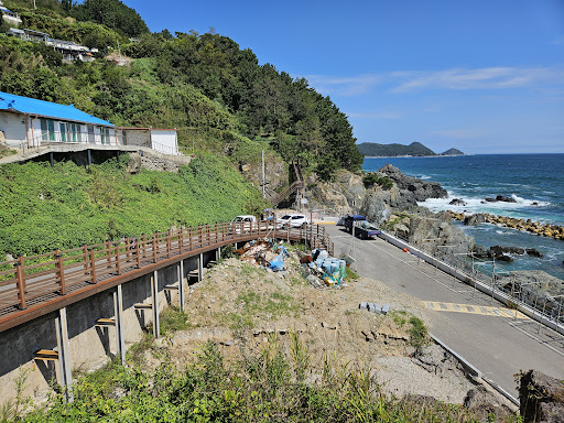 엄청나게 협소한 진입로(양보할 공간이 군데군데 있는 1차선 소로임), 공사 중인 해변과 방파제, 정식 주차장 3면(아래쪽 부둣가쪽에 주차라인 그려진 8~9면 정도 더있긴 함)