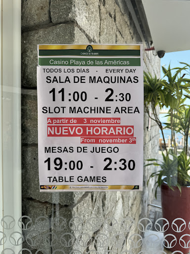 This is an excellent little casino, just down on the beachfront towards Costa Adeje. It has two halves – there is a less formal gaming room with slot machines, video roulette and a bar and, adjacent to that, a slightly more formal gaming room, with table games, bar and a few more gaming machines. The whole place opens at 11am, although I don’t think they do table games until 7pm. In theory you need a passport/ID to access the more formal side and it says it has a dress code, although I didn’t necessarily see that being strictly enforced – take my words at risk…