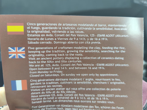 Read moreI just love going there, my husband is having deep talks with the owner and potter Emili and I SHOP :-). Here one find manly handmade artefacts from little vases to huge elaborate storage containers and lamps. It is not a touristy place but all the beautiful things are handmade and Emili is a wonderful and generous person who is doing also items to order. Me encanta ir allí, mi esposo está teniendo conversaciones profundas con el propietario y el alfarero Emili y YO COMPRAR :-). Aquí se encuentran objetos varoniles hechos a mano, desde pequeños jarrones hasta enormes y elaborados contenedores de almacenamiento y lámparas. No es un lugar turístico, pero todas las cosas hermosas están hechas a mano y Emili es una persona maravillosa y generosa que también hace artículos...