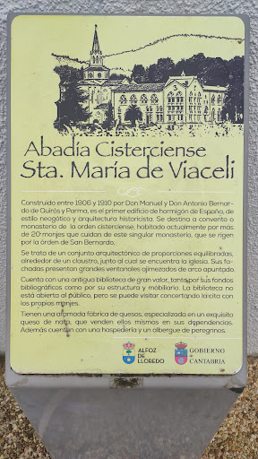 Read moreLa Abadía de Santa María de Viaceli es un monasterio ubicado en la localidad de Cóbreces, municipio de Alfoz de Lloredo, Cantabria España), divisando el Cantábrico y a escasos 500 metros del mismo. Originalmente cisterciense, el monasterio se encuentra habitado en la actualidad por una comunidad de la Orden Cisterciense de la Estrecha Observancia (monjes trapenses). Fue fundado por monjes cistercienses procedentes de la abadía de Santa María del Desierto (Francia) gracias a la donación del patrimonio familiar de D. Antonio y D. Manuel Bernaldo de Quirós. Le corresponde el privilegio de ser el primer edificio en hormigón armado de España. El día 16 de octubre de 1926 es erigido en Abadía. Algunos de sus monjes fueron asesinados durante la persecución religiosa llevada a cabo durante la segunda República Española. En la abadía se fabrica uno de los quesos más afamados de Cantabria y en ella se encuentra la dirección de la...
